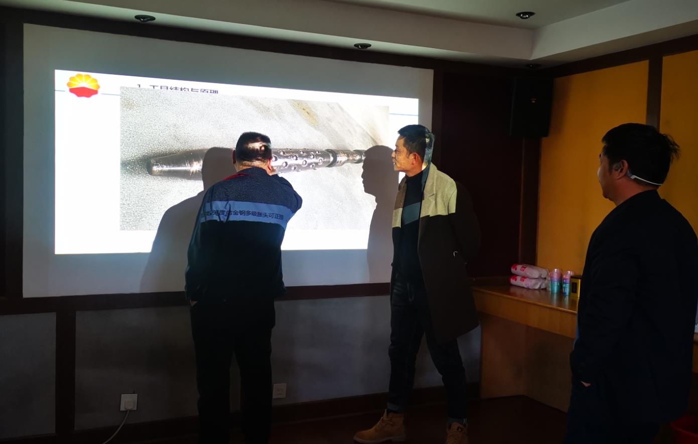 采油二廠工程地質(zhì)研究所人員對工具提出了疑問,工具研究發(fā)明人馬永生一一做出了回復和解釋,最終東昊公司套管液壓整形工具的前端性能和工藝的安全性能贏得了采油廠工具所的贊同,現(xiàn)場分析了一口套管變形井況,并討論了整形施工方案。
